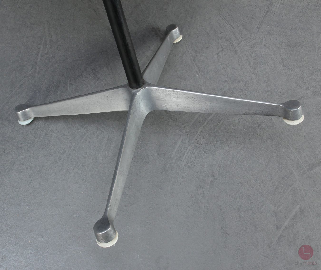 Das schwarze Drehgestell mit Alumnium Fußkreuz befindet sich in gutem Zustand und hat noch die originale weißen Kunststoff Gleiter montiert.