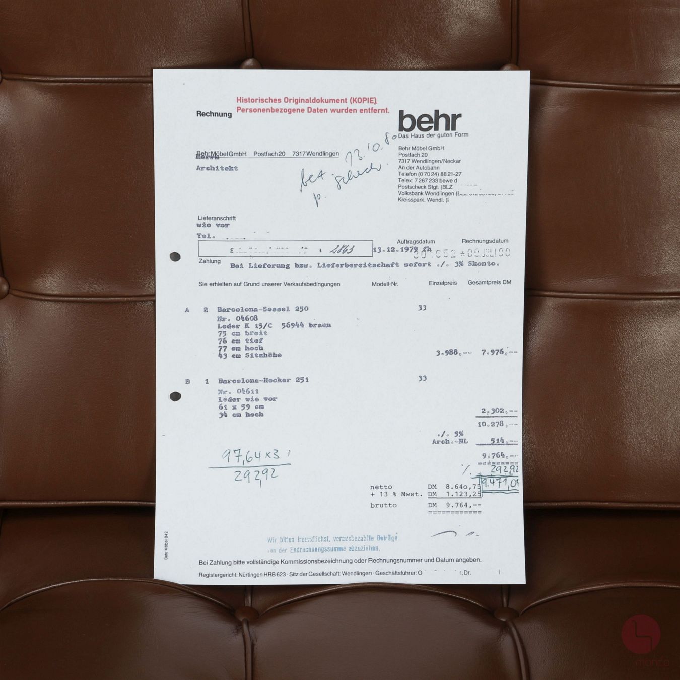 Es handelt sich um einen Barcelona Sessel, aus erster Hand. Er stammt aus einem Architekten Haushalt aus dem Stuttgarter Raum. Der Sessel wurde dort im Jahr 1979 bei dem bis heute allseits bekannten Möbelhaus Behr erworben. Die Echtheit lässt sich an Hand der beiliegenden Originalrechnung nachvollziehen. In einem weiteren Angebot verkaufen wir einen dazugehörigen Barcelona Sessel inkl. Ottoman, auf dem noch der original Knoll Aufkleber vorhanden ist.