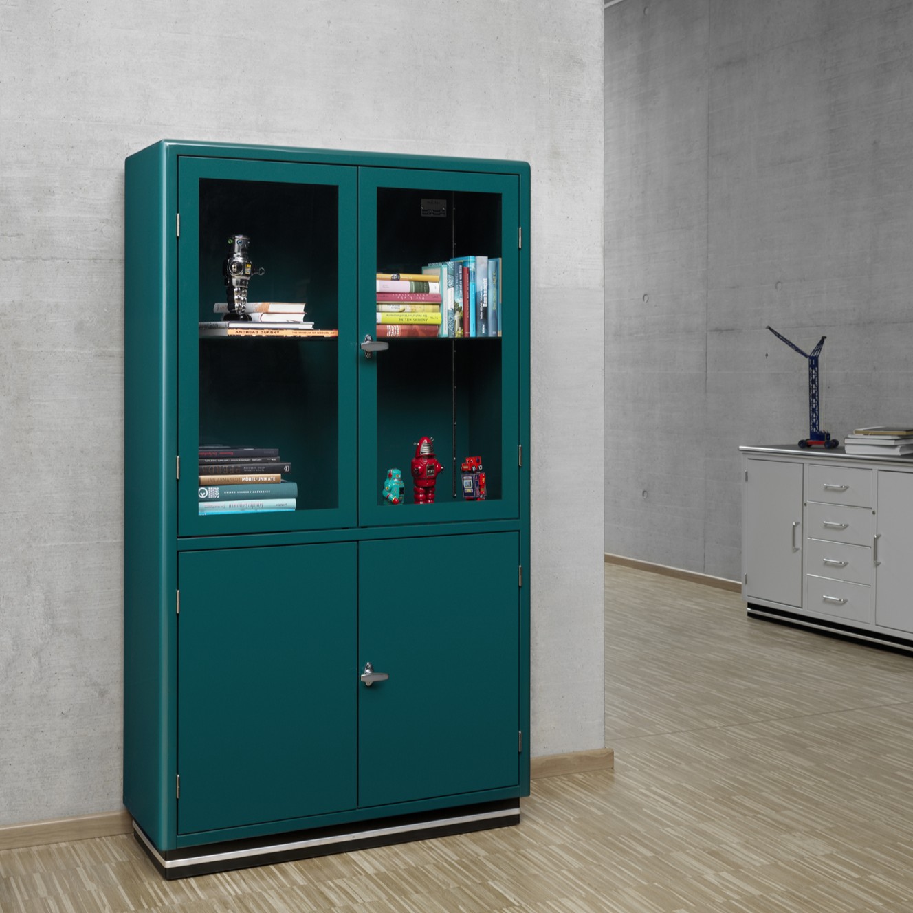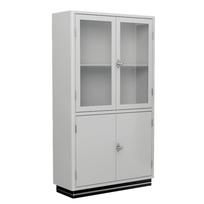 Gefertigt aus lackiertem Stahl, ist die Oberfläche wahlweise hochglänzend oder seidenmatt ausgeführt und kann in zahlreichen RAL-Farben realisiert werden. Ergänzende Optionen wie satinierte Glastüren, eine integrierte LED-Innenbeleuchtung oder zusätzliche Einlegeböden erlauben eine präzise Anpassung an unterschiedliche Nutzungskonzepte – ob im Büro, in der Praxis oder im privaten Umfeld.