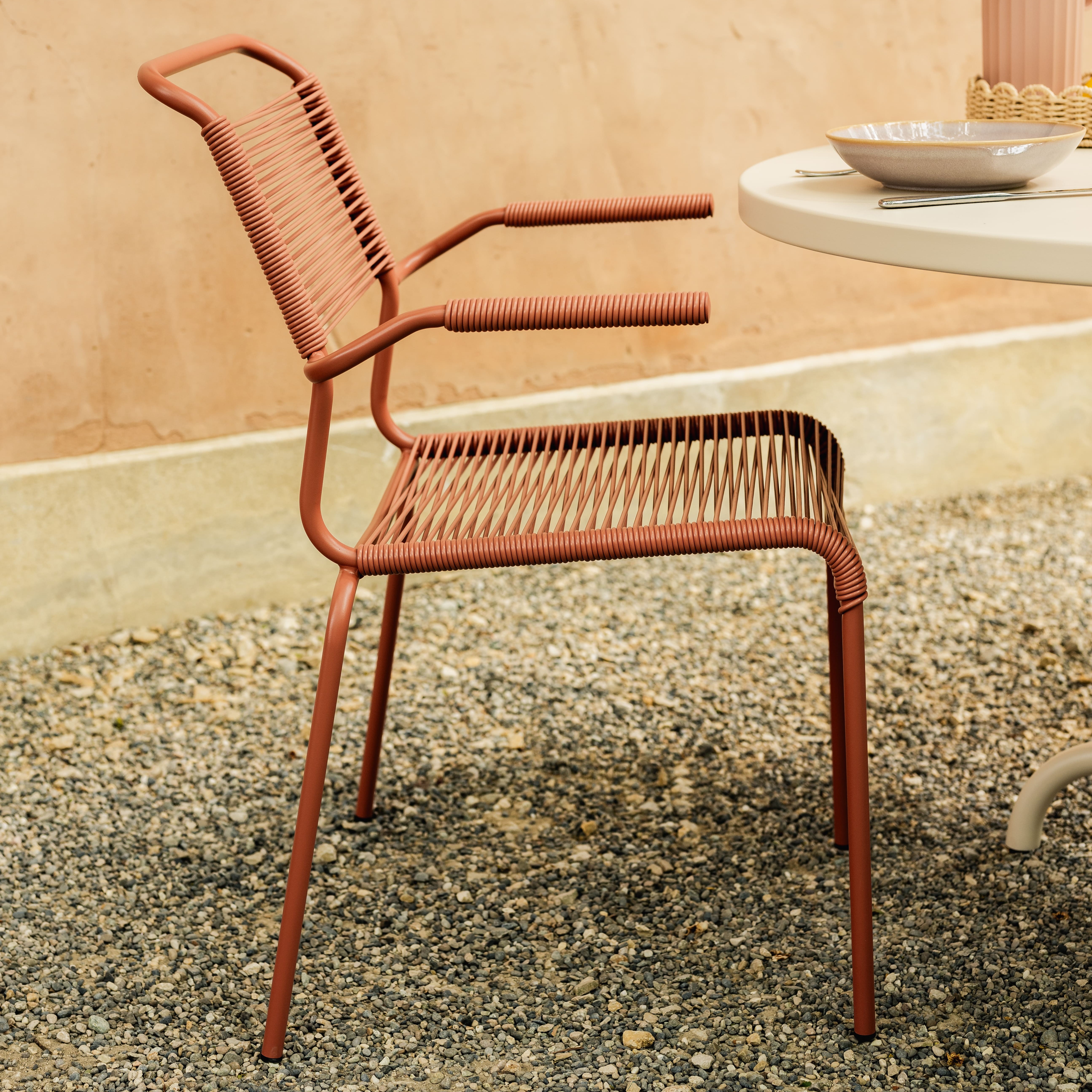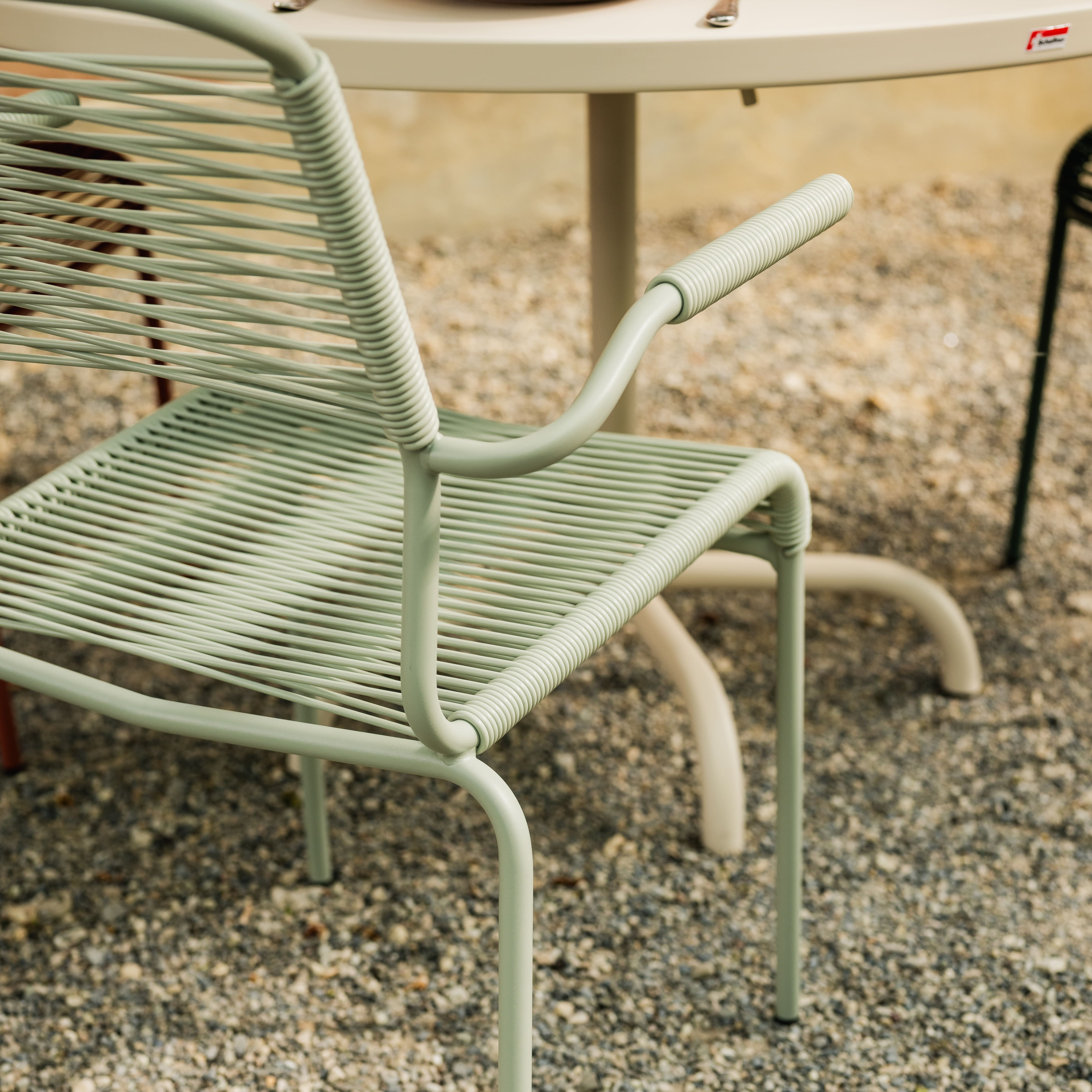 Der Säntis Schaffner Spaghetti Stuhl mit Armlehnen vereint zeitloses Design mit Schweizer Qualität. Die Sitzfläche besteht aus wetterfesten Spaghetti-Schnüren, die für ein angenehmes Sitzgefühl sorgen. Das Gestell ist aus robustem Stahlrohr gefertigt, das mit einer reinen Polyesterpulver-Beschichtung versehen ist – ideal für den Einsatz im Freien.