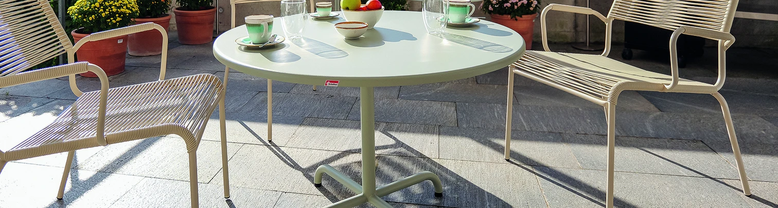 Für kleinere Flächen bieten wir zusätzlich eine Variante mit einem Durchmesser von 72 cm an. Die Tischplatte besteht aus hochwertigem Fiberglas mit 25 % Glasfaseranteil, was für zusätzliche Stabilität sorgt. Sie ist abklappbar, wetterfest und pflegeleicht, perfekt für den ganzjährigen Einsatz im Freien.