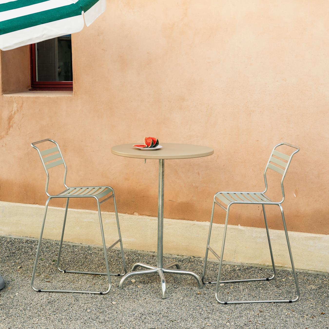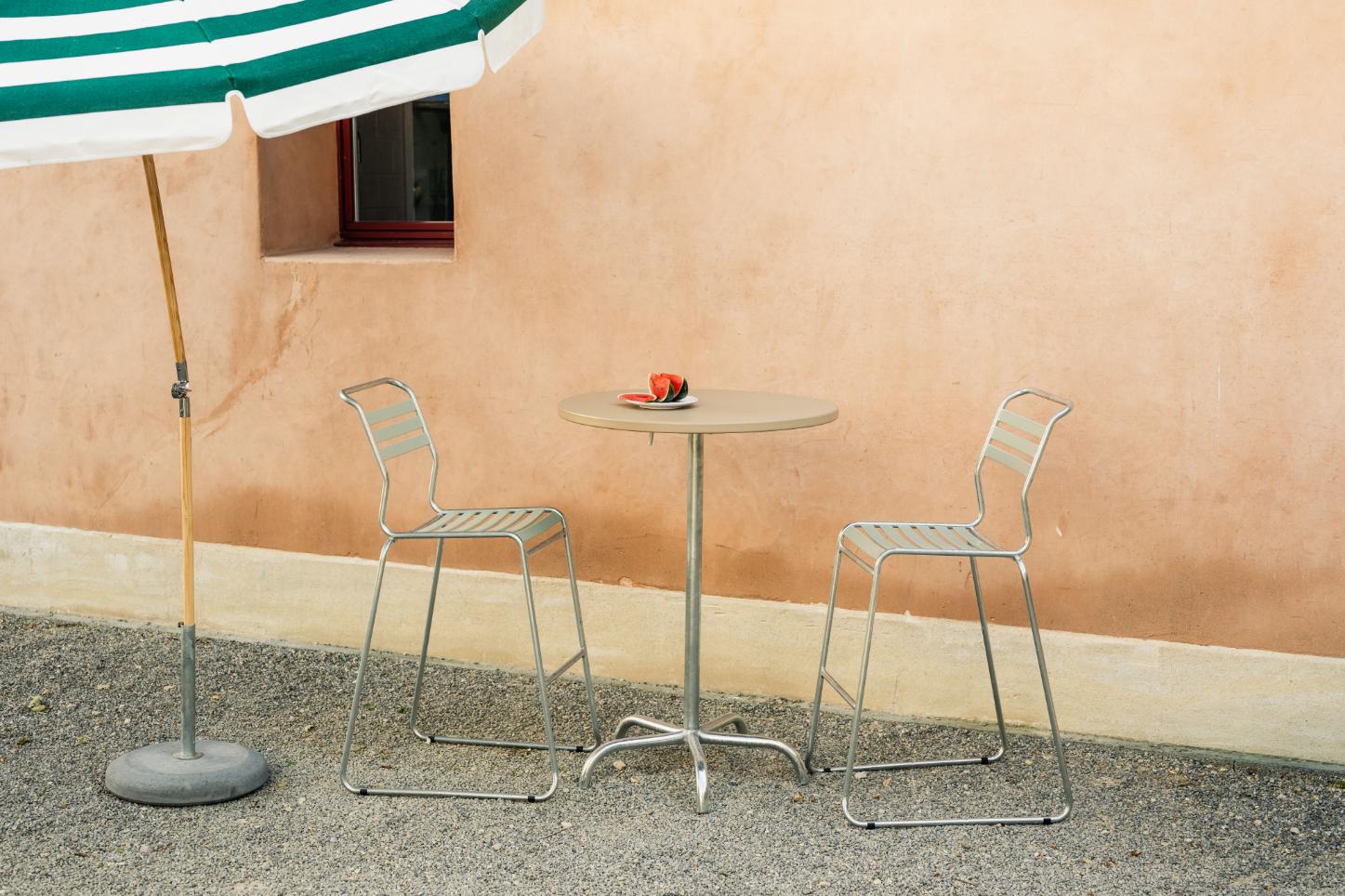 Die Tischplatte besteht aus verzinktem Stahlblech mit reiner Polyesterpulverbeschichtung. Dadurch entsteht eine widerstandsfähige, pflegeleichte Oberfläche, die dauerhaft wetterfest ist und auch bei intensiver Nutzung ihre Qualität behält. Die Platte ist abklappbar konstruiert und ermöglicht eine platzsparende Lagerung. Das Gestell wird aus feuerverzinktem Stahlrohr gefertigt beziehungsweise verzinkt und zusätzlich beschichtet, je nach Ausführung. Eine integrierte Sturmsicherung mit Selbstarretierung sorgt für Stabilität und Sicherheit im Gebrauch. Die Konstruktion ist demontierbar ausgeführt und vollständig für den Außenbereich geeignet.