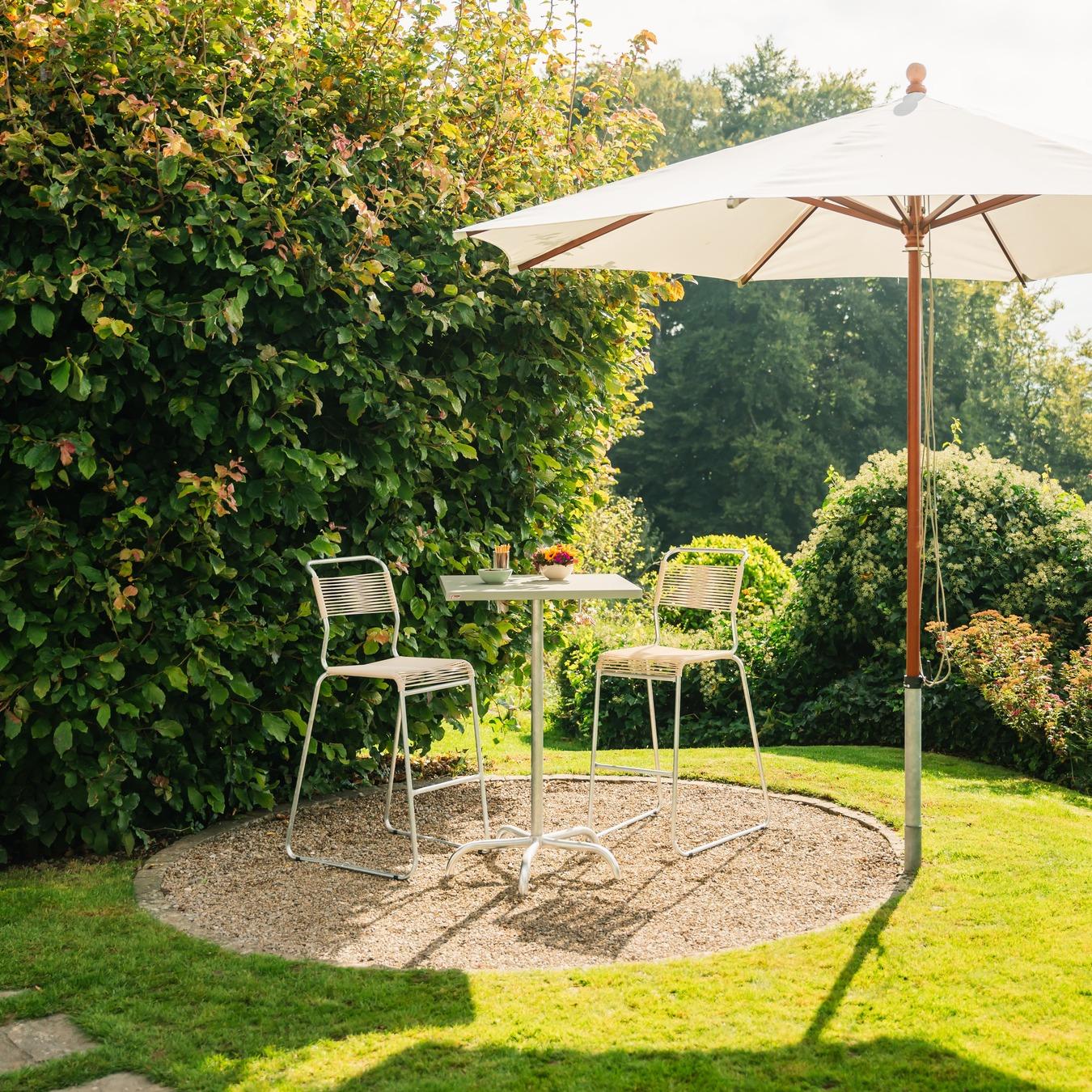 Die Tischplatte besteht aus verzinktem Stahlblech mit reiner Polyesterpulverbeschichtung. Dadurch entsteht eine widerstandsfähige, pflegeleichte Oberfläche, die dauerhaft wetterfest ist und auch bei intensiver Nutzung ihre Qualität behält. Die Platte ist abklappbar konstruiert und ermöglicht eine platzsparende Lagerung. Das Gestell wird aus feuerverzinktem Stahlrohr gefertigt beziehungsweise verzinkt und zusätzlich beschichtet, je nach Ausführung. Eine integrierte Sturmsicherung mit Selbstarretierung sorgt für Stabilität und Sicherheit im Gebrauch. Die Konstruktion ist demontierbar ausgeführt und vollständig für den Außenbereich geeignet.