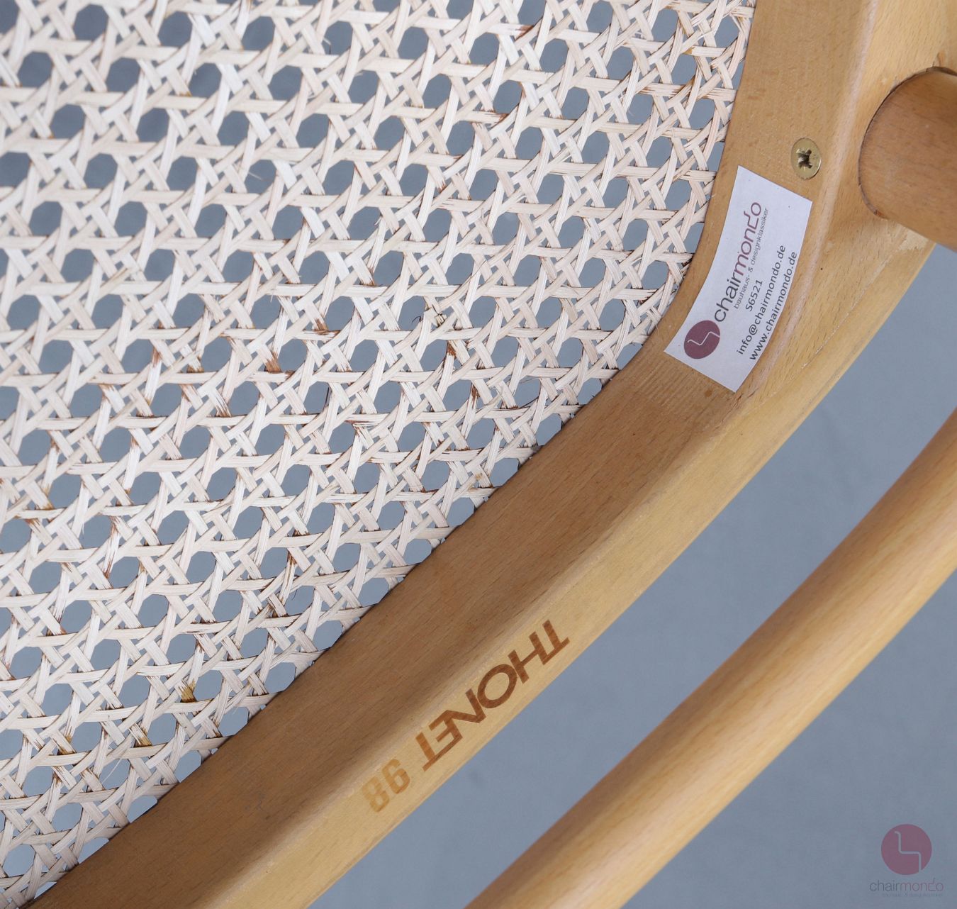 Der Stuhl stammt aus dem Produktionsjahr 1998. Auf der Unterseite der Sitzfläche ist die originale Thonet Gravur mit Baujahr vorhanden. Der Stuhl ist bereits mit Filzgleitern ausgestattet, die eine Benutzung auch auf empfindlichen Böden ermöglichen.