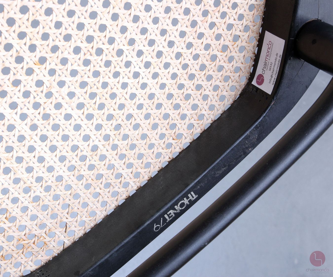 Auf der Unterseite ist jeweils das Thonet Logo mit dem Baujahr 1979 zu erkennen. Der Stuhl wird heute in der Variante mit Armlehnen nicht mehr produziert und daher immer seltener zu finden.