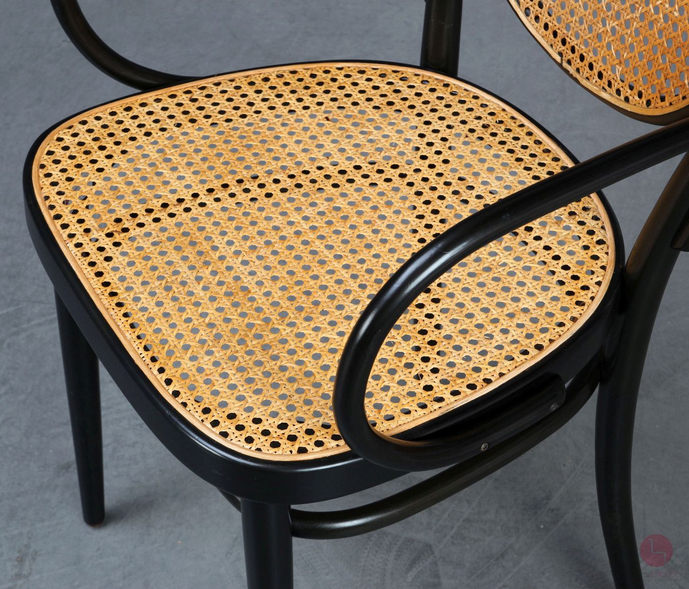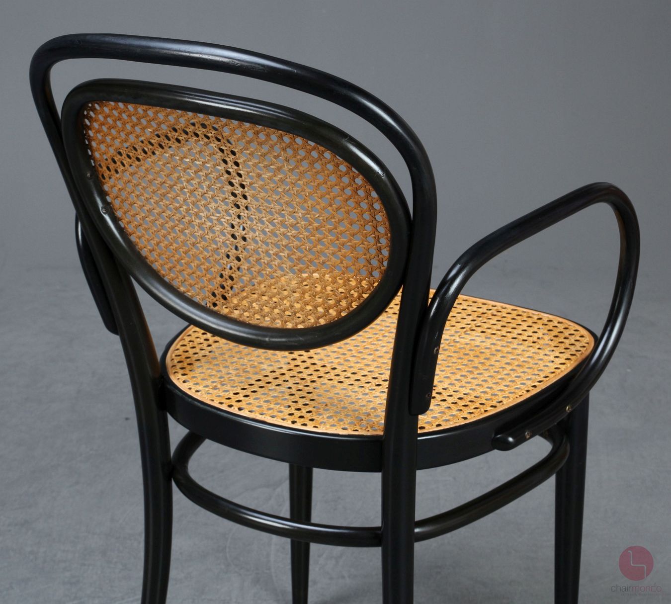 Bei uns erhalten Sie das Modell 215 RF in einer schönen Ausführung mit Wiener Geflecht und schwarzer Lackierung. Der Stuhl ist als Variante des 214er zusätzlich mit einer Rückenlehne und edel anmutenden Armlehnen ausgestattet, die den Stuhl sehr bequem machen.