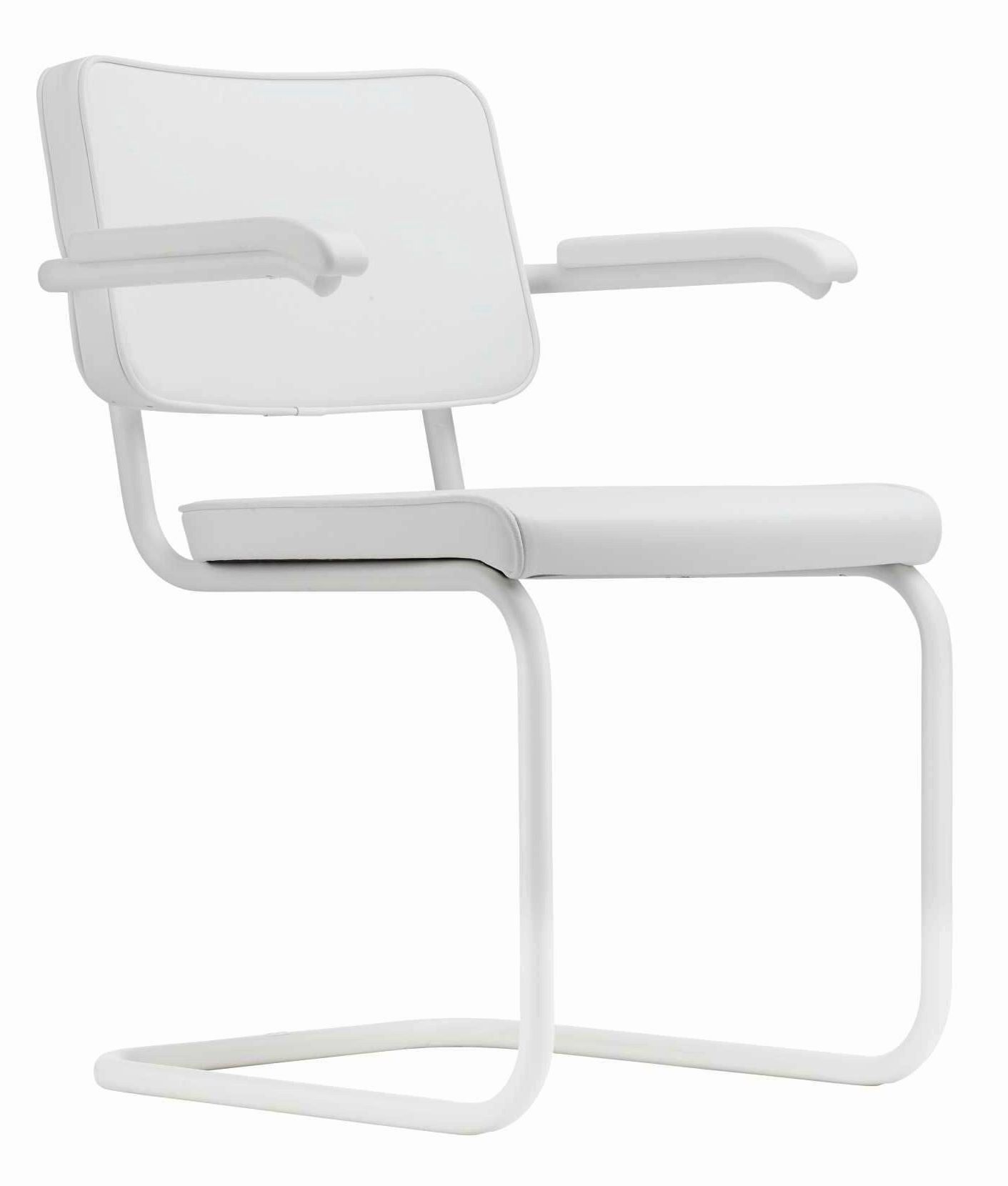 Bei uns erhalten Sie den bekannten Thonet Klassiker in einer vollgepolsterten Version mit hochwertigem Nappaleder in verschiedenen Farben. Zudem haben Sie die Wahl zwischen verschiedenen Armauflagen in Buche Schwarz gebeizt, Eiche-, Esche oder Nussbaum Holz.