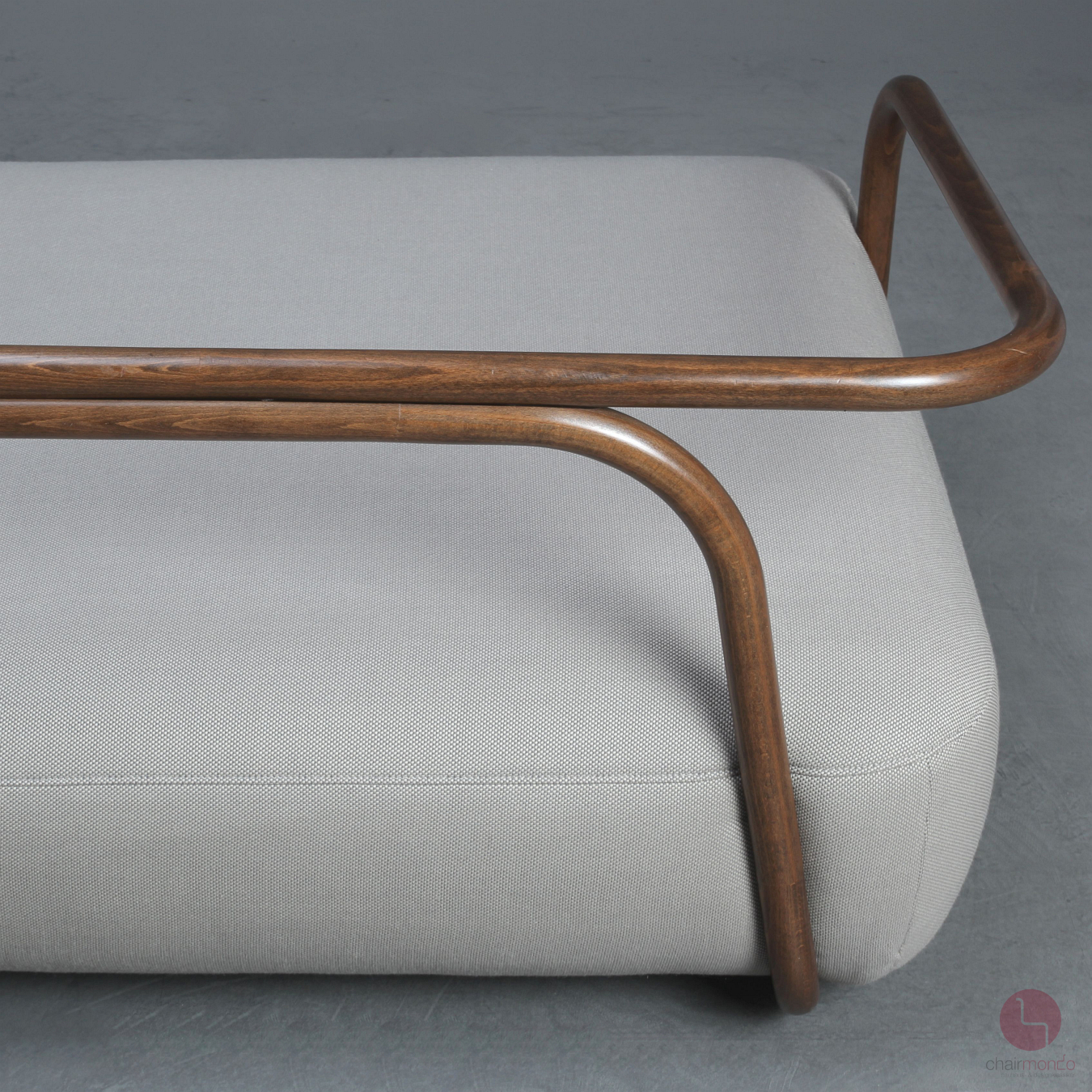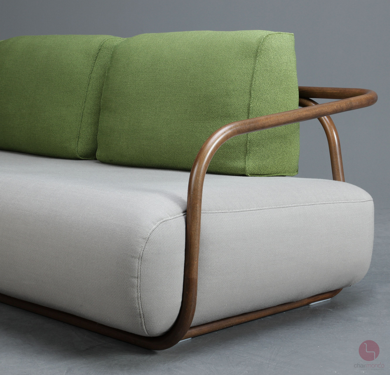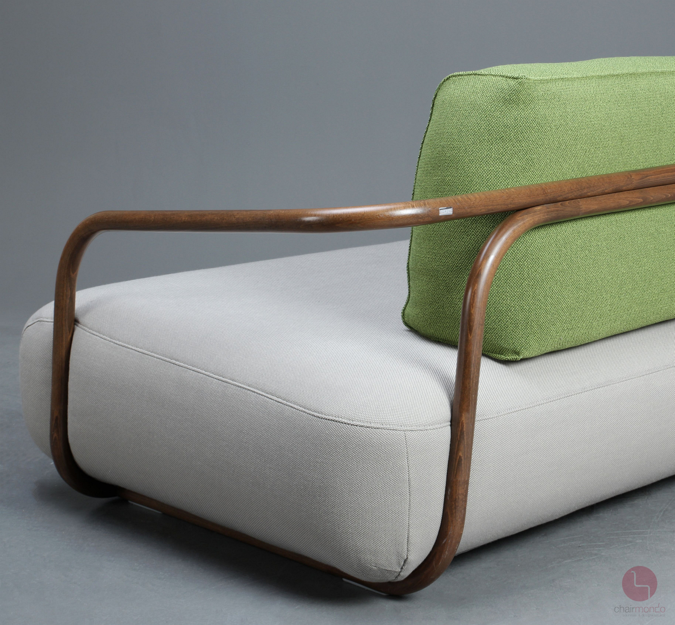 Bei uns erhalten Sie das bequeme Thonet 2002 Sofa mit hochwertigem grauem Sitzbezug (stone), grünen Rücken- und Kissenbezügen, sowie nussbaum-braun gebeitztem Bugholzgestell.