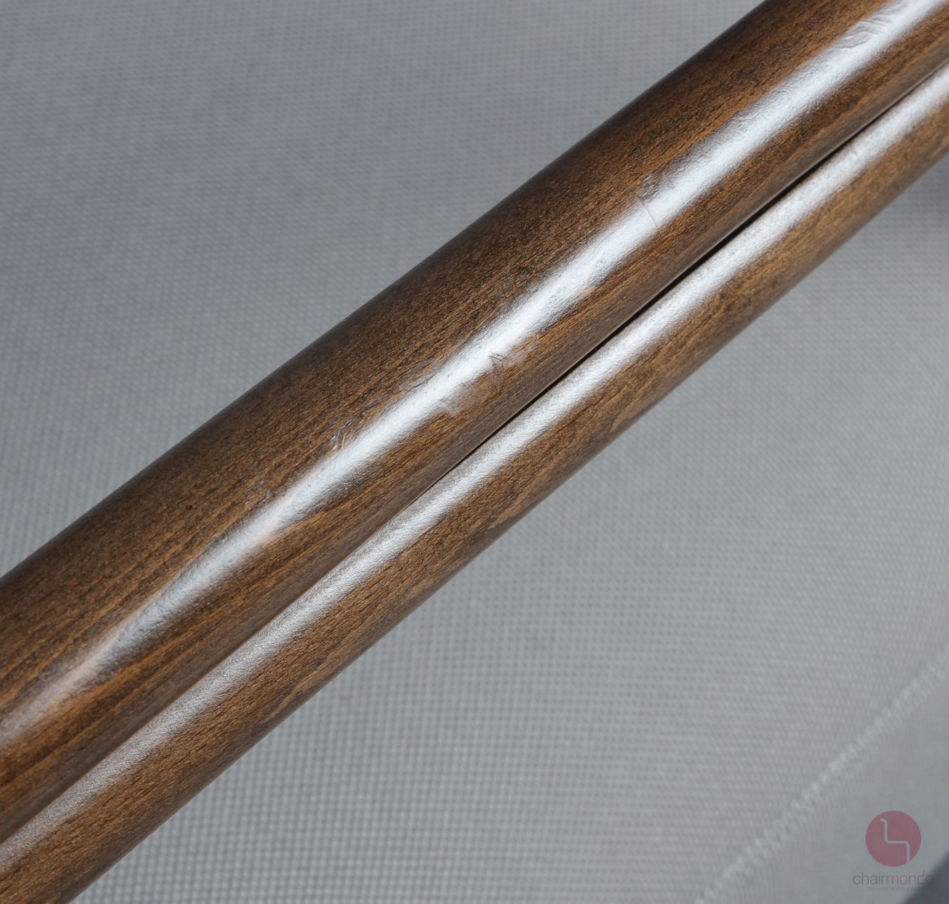 Bei dem Gestell handelt es sich um ein aufwendig produziertes Bugholz Gestell aus Esche Holz, das nussbaumfarbig gebeizt wurde. Es lässt sich dadurch sehr schön die natürliche Maserung des Holzes erkennen. Es sind bereits Filzgleiter angebracht, die eine Benutzung auch auf empfindlichen Böden ermöglichen.