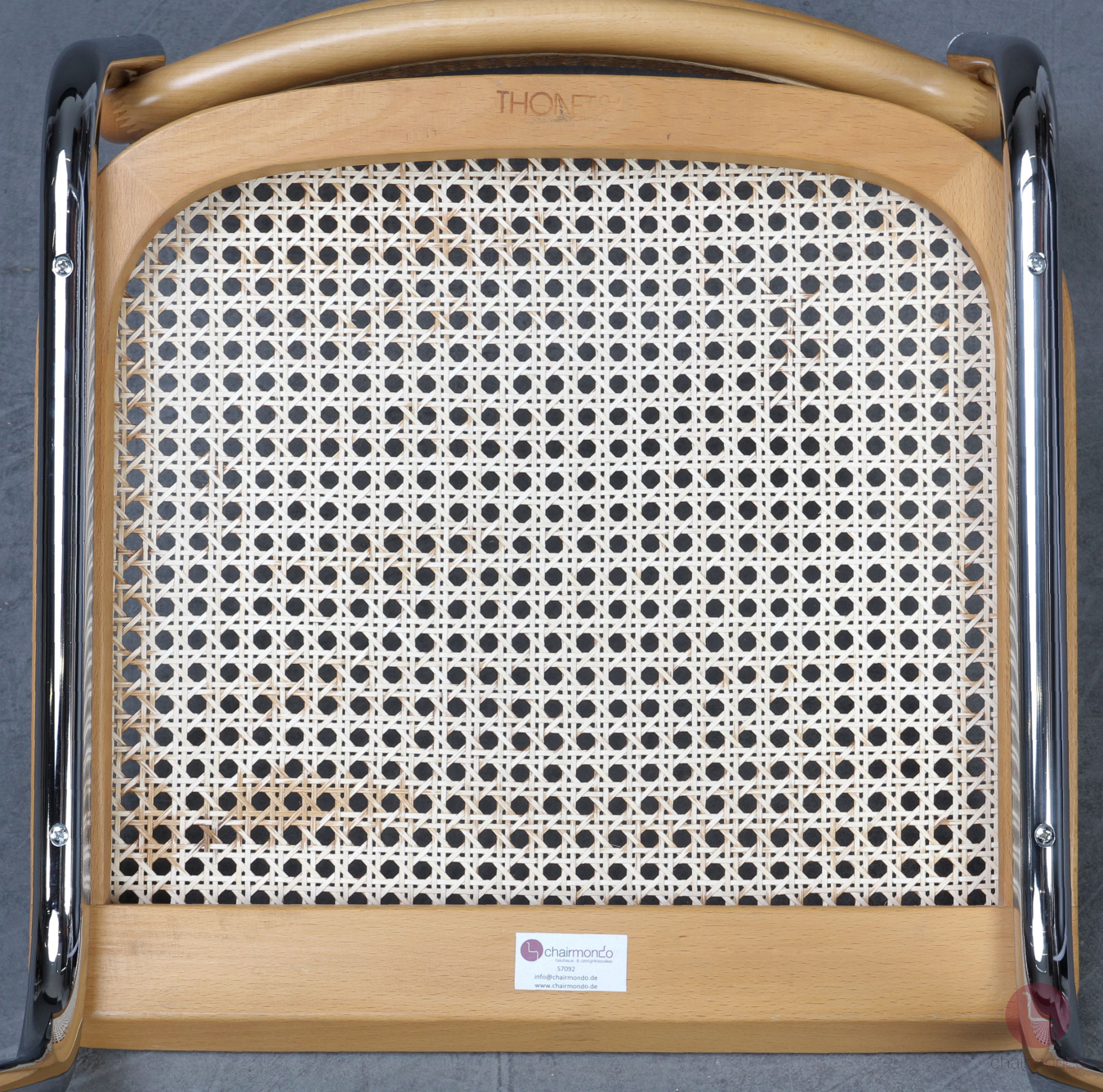 Die Stühle stammen aus dem Herstellungsjahr 1984 (2x) und 1979 (1x). Auf der Unterseite ist jeweils die originale Thonet Prägung mit Baujahr vorhanden. Das verchromte Gestell befindet sich in sehr gutem Zustand und glänzt wunderbar. Auf Wunsch können Filzgleiter von uns angebracht werden, die eine Benutzung auch auf empfindlichen Böden ermöglichen.