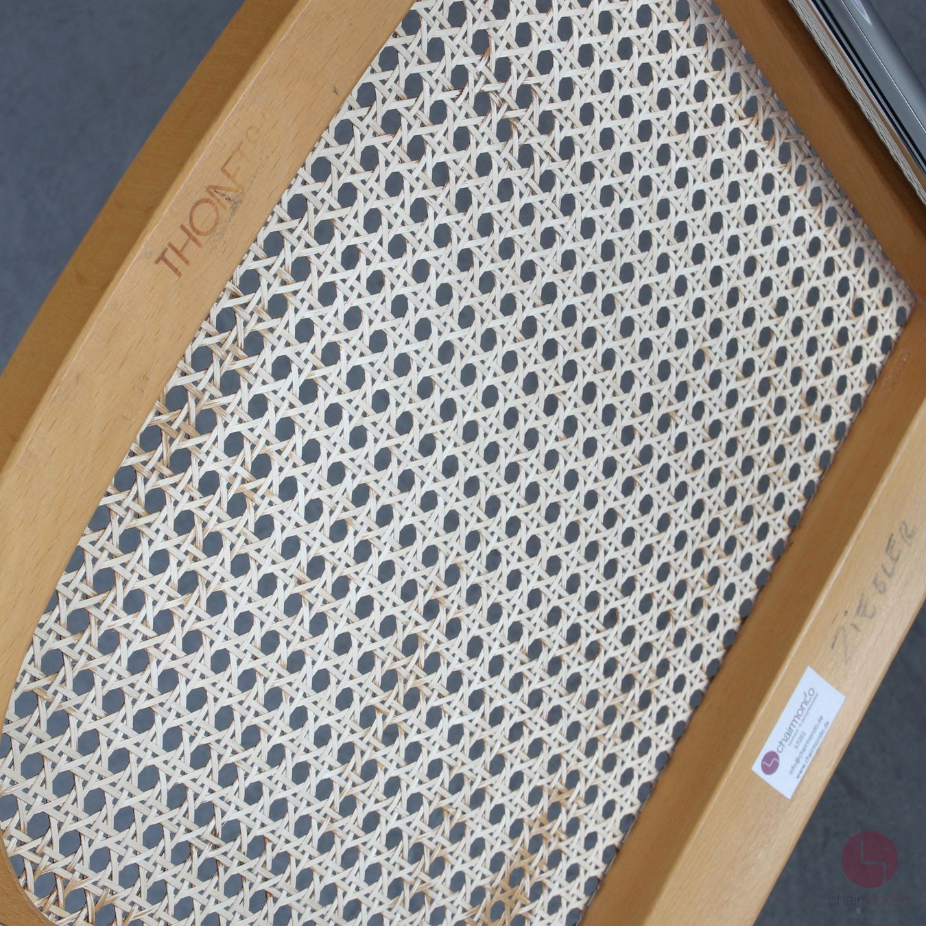 Die Stühle befinden sich in einem sehr guten gebrauchten Zustand. Das Wiener Geflecht ist vollkommen intakt und hat über die Jahre eine schöne Patina bekommen. Das Geflecht der Sitzflächen wurde erneuert und farblich wieder der Farbpatina der Rückenlehne angepasst. Die Lackierung befindet sich ebenfalls in sehr gutem gebrauchten Zustand. Sie hat eine schöne glänzende Patina mit nur leichten Gebrauchsspuren.