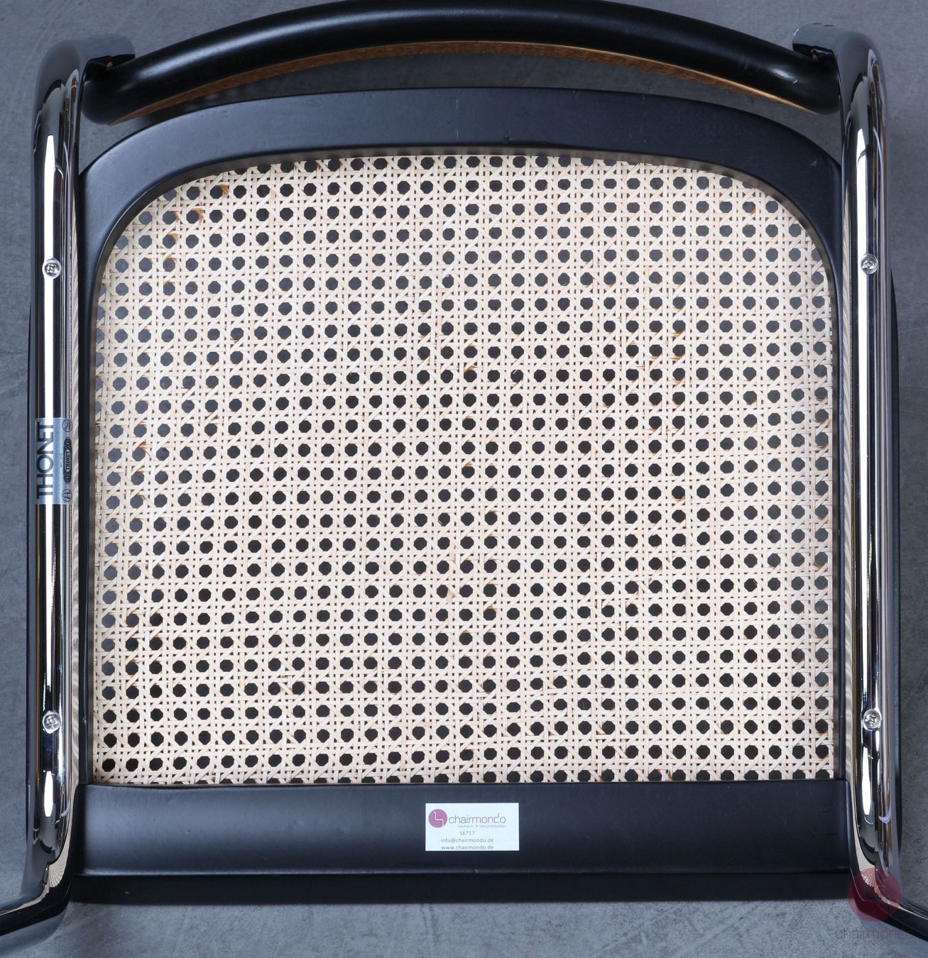 Das verchromte Gestell befindet sich in sehr gutem Zustand und glänzt wunderbar. Es handelt sich um ein komplett neues Thonet Gestell aus dem Baujahr 2025 - weshalb der Stuhl bereits über die neue Sitzhöhe von 45 cm verfügt. Auf Wunsch können Filzgleiter von uns angebracht werden, die eine Benutzung auch auf empfindlichen Böden ermöglichen. Mit Filzhgleitern erhöht sich die Sitzhöhe um ca 1 cm auf 46 cm.