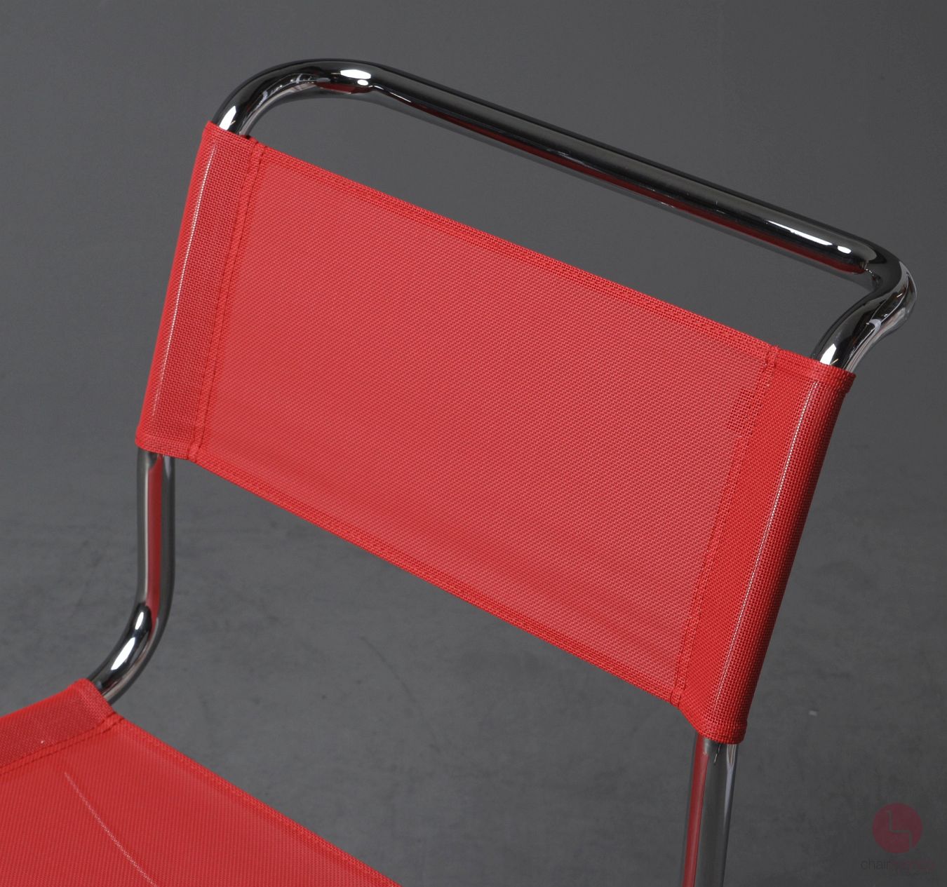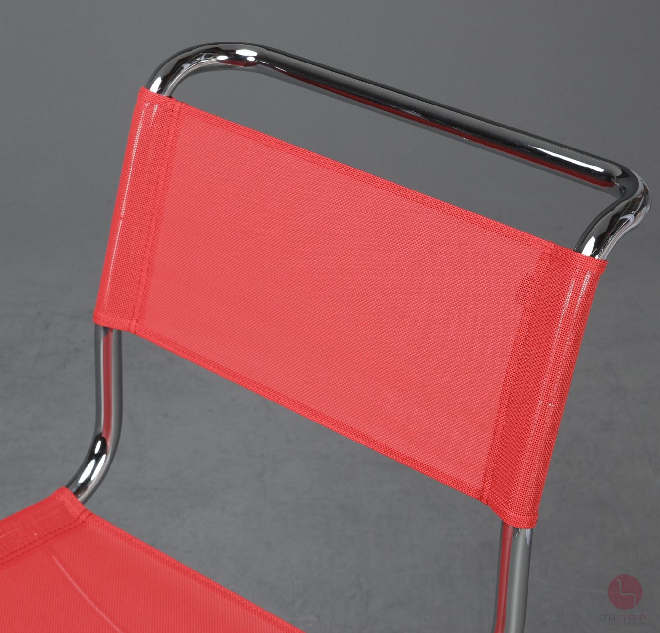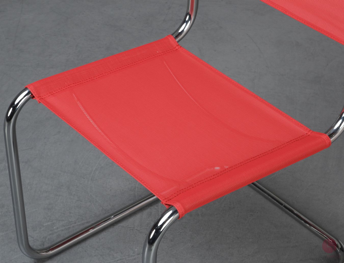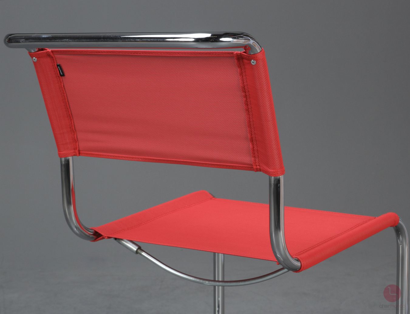 Bei uns erhalten Sie den Freischwinger Modell S33 N in einer sehr seltene Ausführng mit erneuertem kirschroten Netzgewebe und verchromtem Gestell