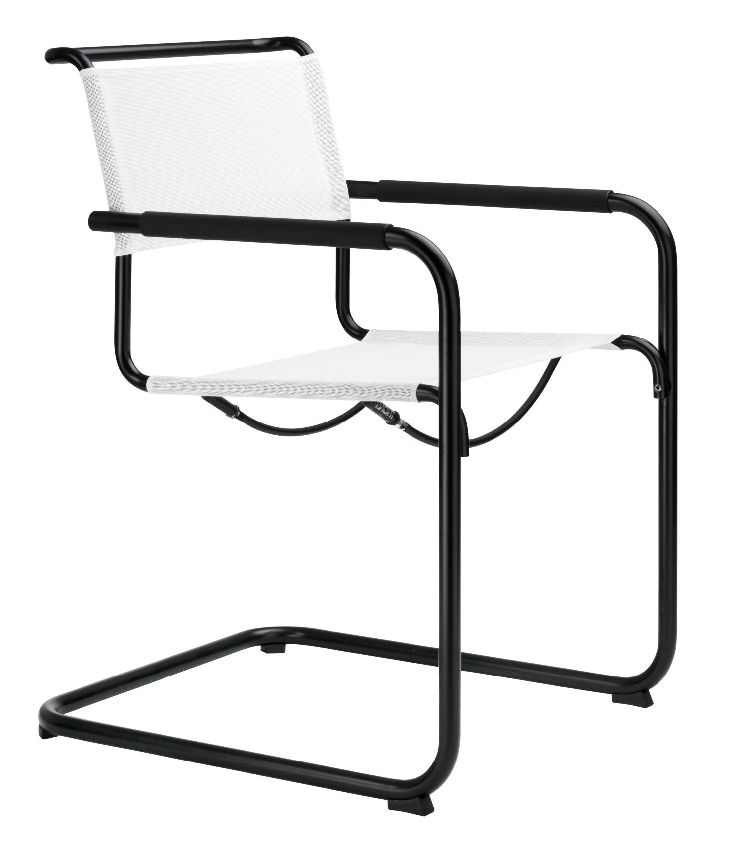 Der S34 zeichnet sich durch seine kubische Form und klare Linienführung aus, die ihm eine schlichte, aber dennoch beeindruckende Ästhetik verleihen. Das stabile Stahlrohrgestell sorgt für eine federnde, leicht schwingende Bewegung, die höchsten Sitzkomfort bietet. Der Verzicht auf die hinteren Stuhlbeine verleiht dem Freischwinger seine charakteristische Leichtigkeit und Flexibilität. Im Gegensatz zum S33 verfügt der S34 über zusätzliche Armlehnen, die mit hochwertigen Auflagen aus Iroko oder Elastomer Hülsen ausgestattet sind.