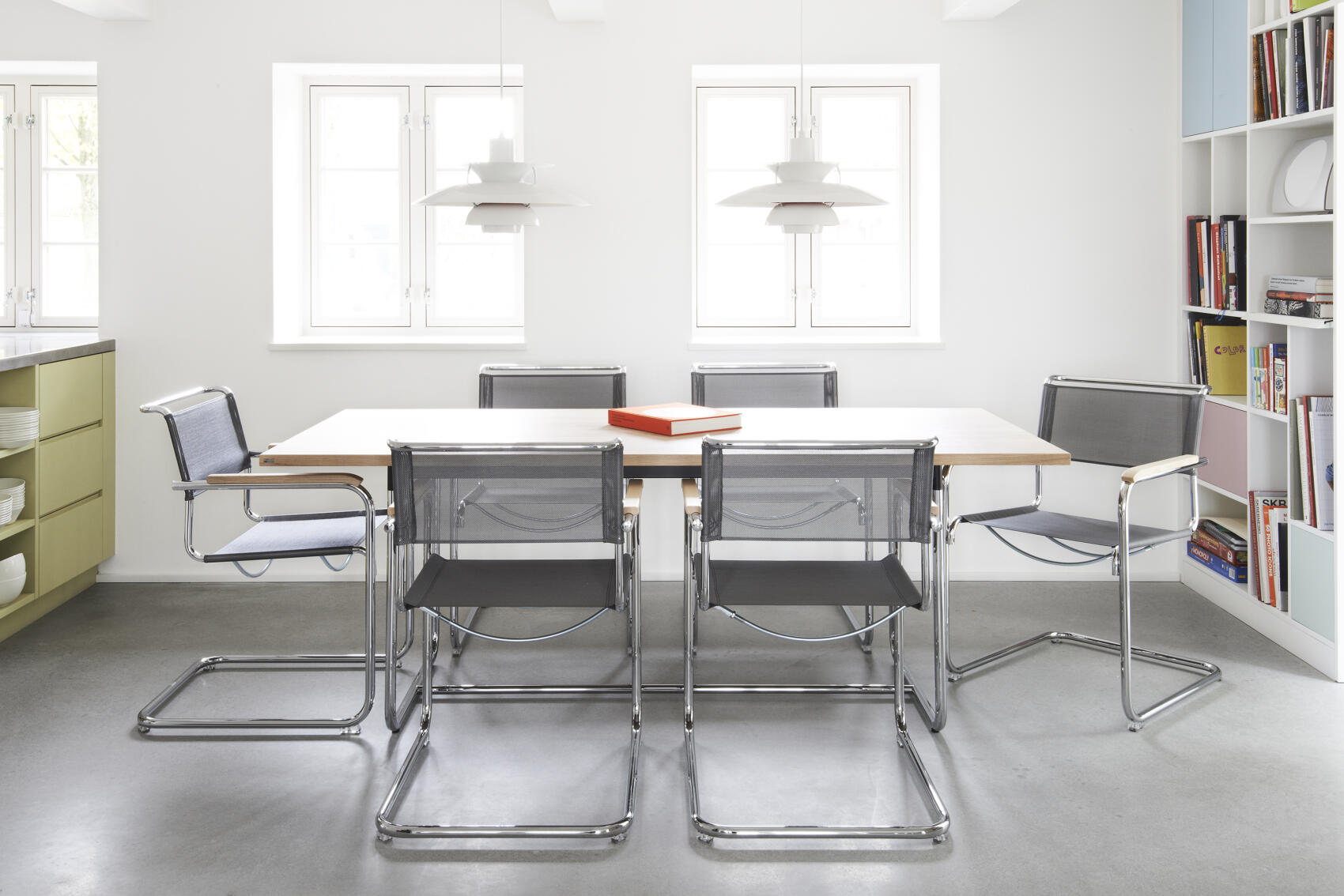 Der S34 zeichnet sich durch seine kubische Form und klare Linienführung aus, die ihm eine schlichte, aber dennoch beeindruckende Ästhetik verleihen. Das stabile Stahlrohrgestell sorgt für eine federnde, leicht schwingende Bewegung, die höchsten Sitzkomfort bietet. Der Verzicht auf die hinteren Stuhlbeine verleiht dem Freischwinger seine charakteristische Leichtigkeit und Flexibilität. Im Gegensatz zum S33 verfügt der S34 über zusätzliche Armlehnen, die mit hochwertigen Auflagen aus Buchenholz ausgestattet sind.
