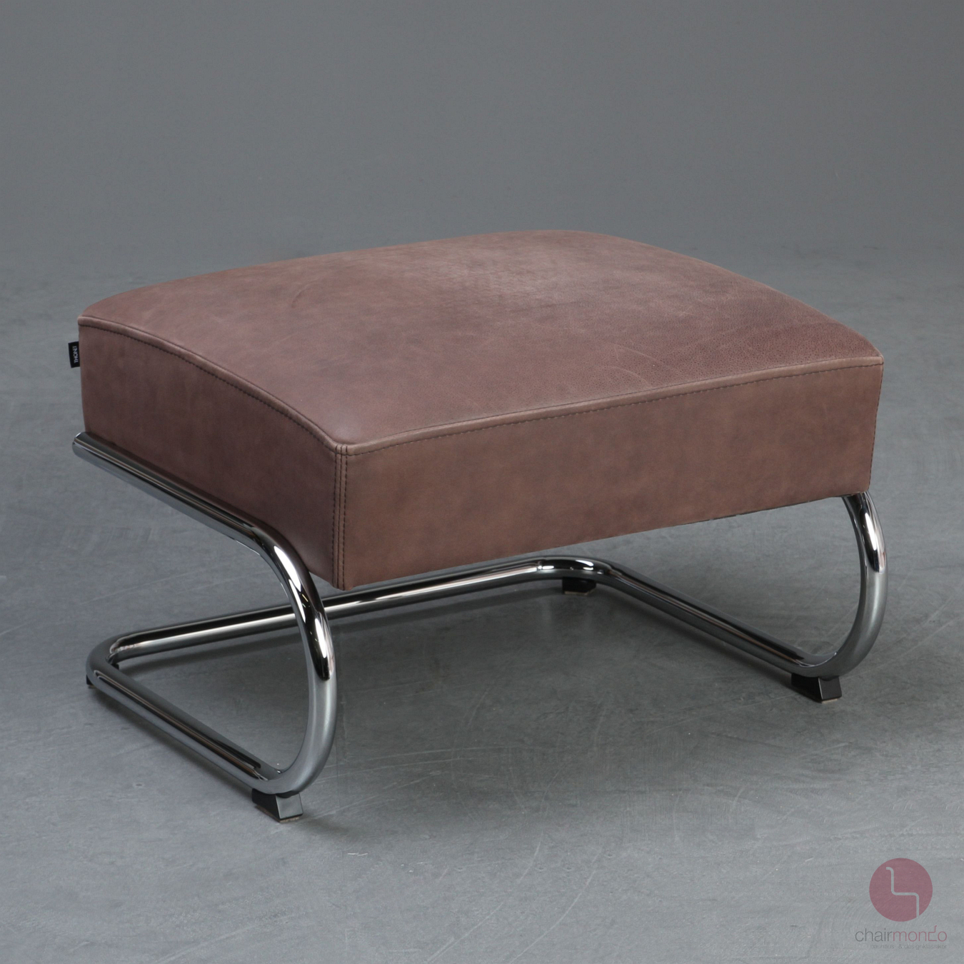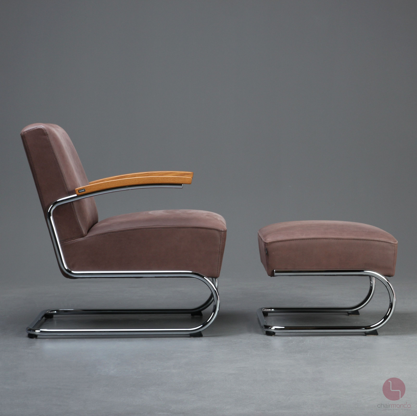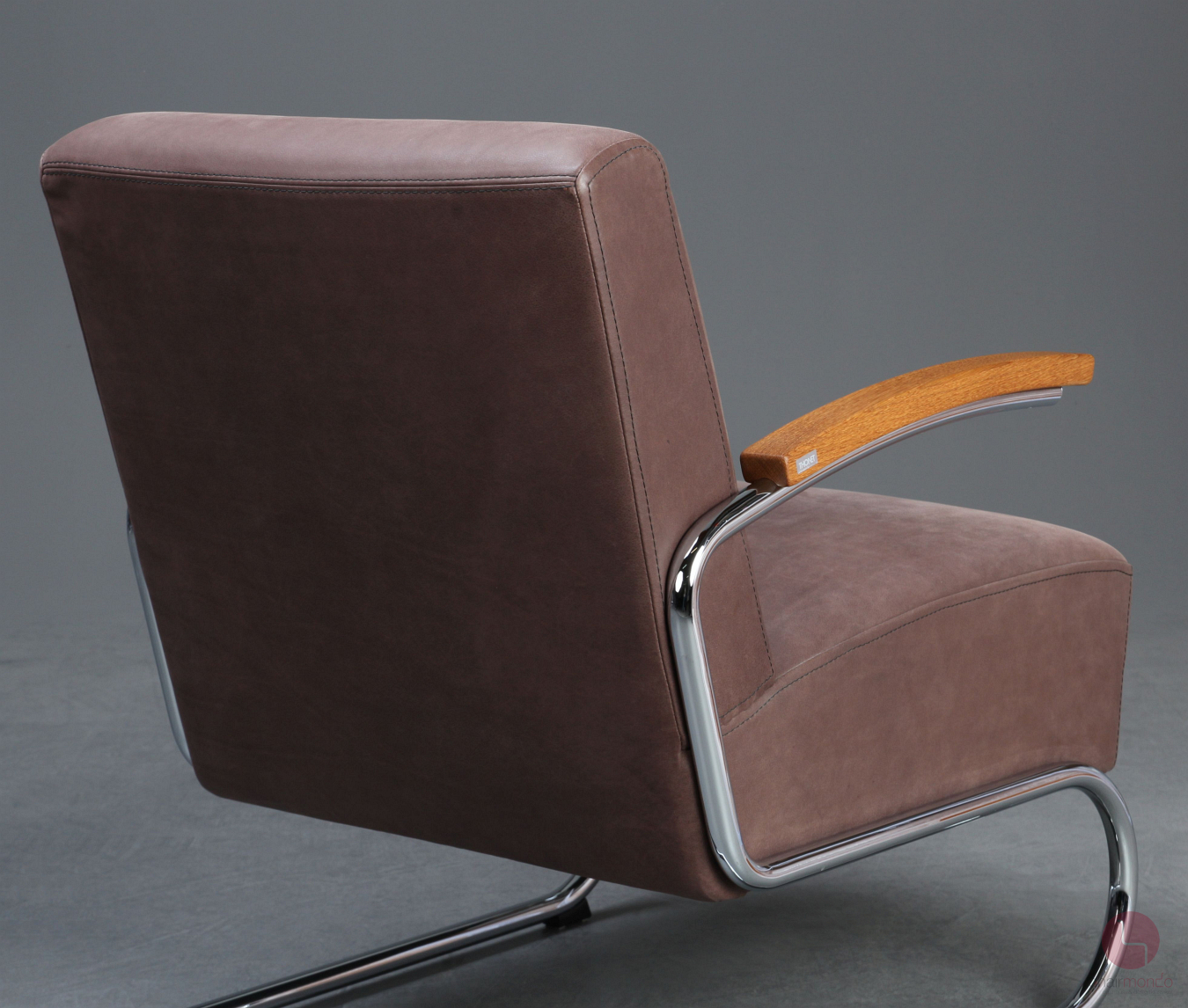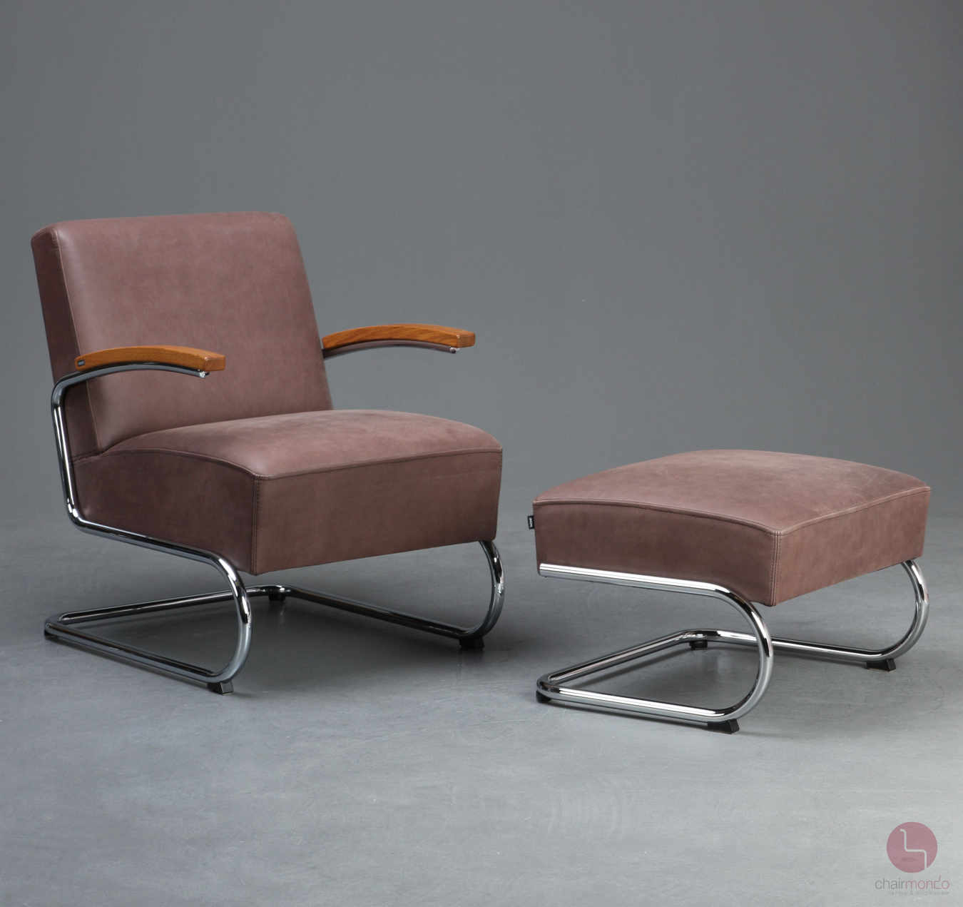 Bei uns erhalten Sie den bequemen Freischwinger Sessel in einer sehr hochwertigen Ausführung mit vollnarbigem Nubukleder in Dunkelbraun, Eiche Armlehnen und dem zugehörigen Fußhocker.
