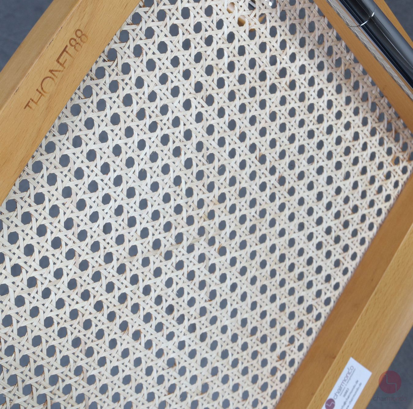 Der Stuhl befindet sich in einem sehr guten gebrauchten Zustand. Das Geflecht der Sitzfläche wurde erneuert und farblich wieder dem Geflecht der Rückenlehne angepasst. Das Geflecht hat insgesamt eine sehr schöne Farbpatina und passt farblich hervorragend zum patinierten Buchenholz. Der Stuhl ist mit Baujahr 1988 gelabelt. Auf der Unterseite der Sitzfläche ist die Thonet Gravur mit Baujahr vorhanden.