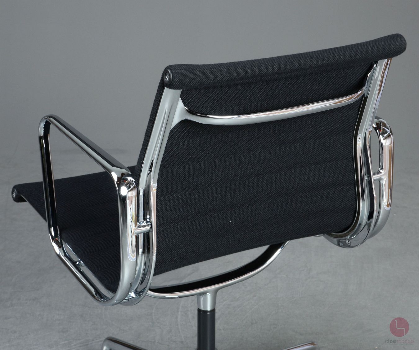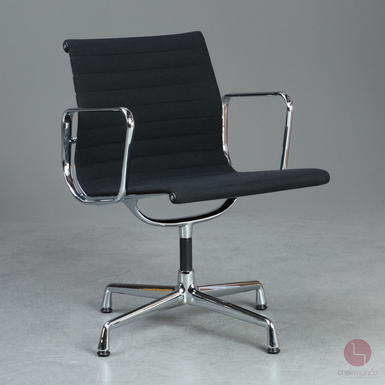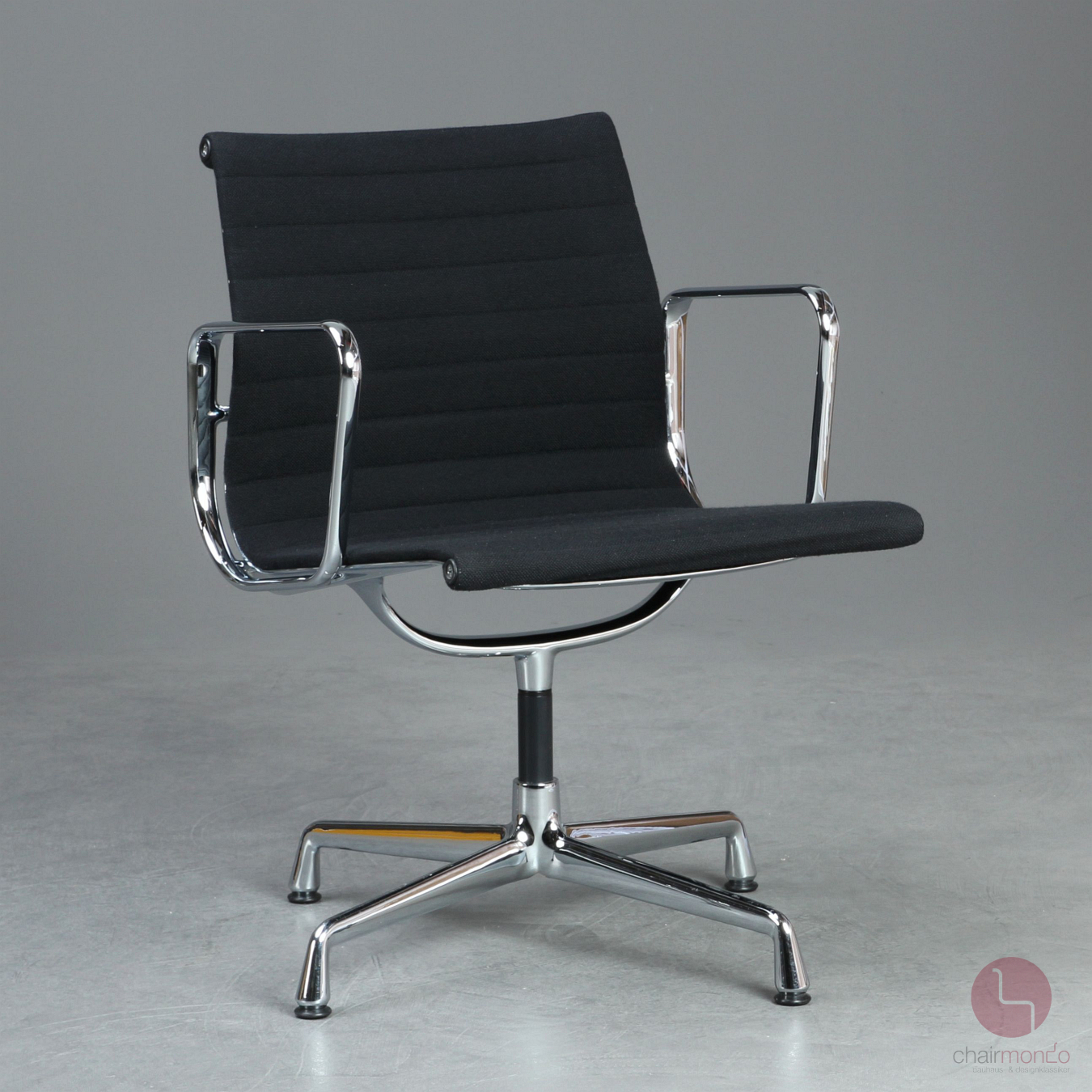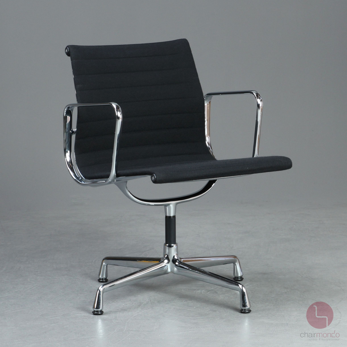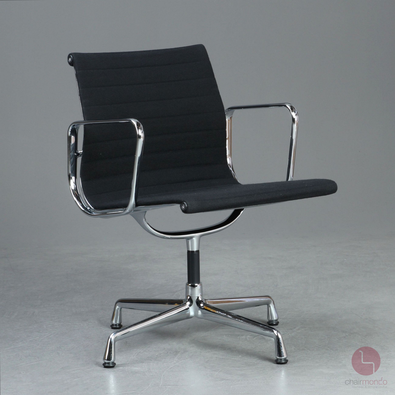 Bei uns erhalten Sie den Designklassiker in der Ausfühurng mit schwarzem Hopsak Bezug, Gestell und Armlehnen sind aus verchromtem Aluminium.