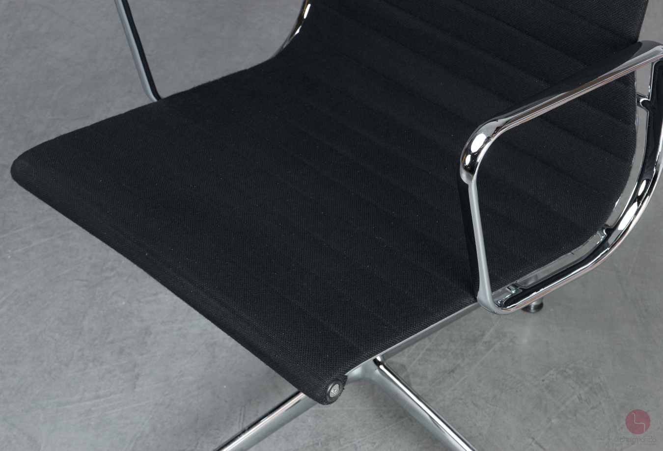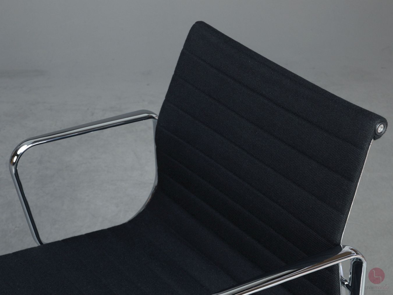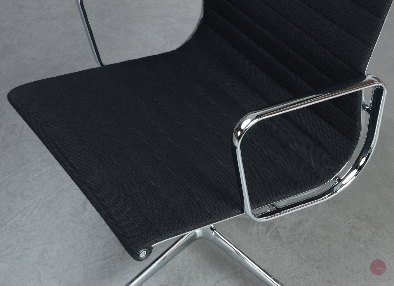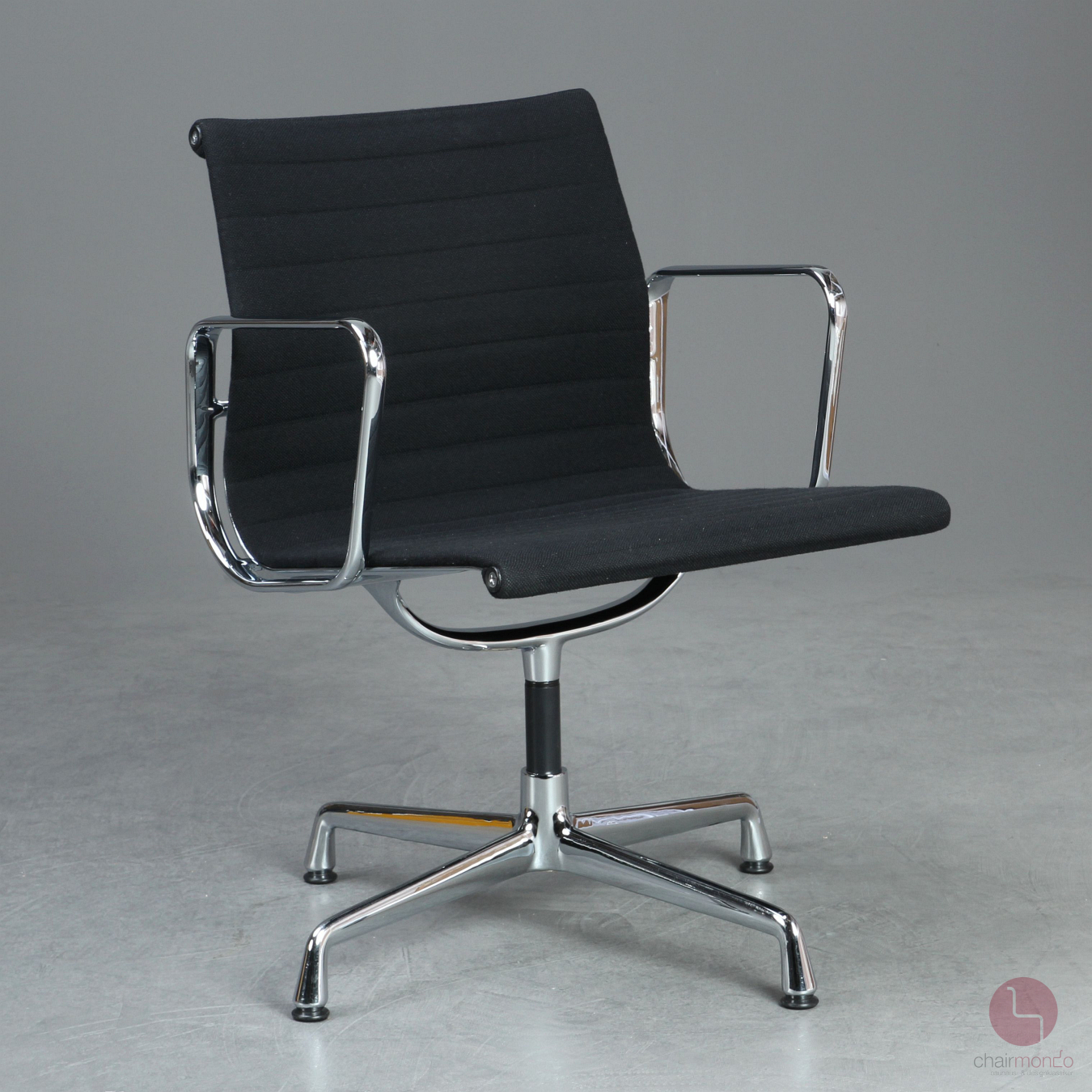 Bei uns erhalten Sie den Designklassiker in der Ausfühurng mit schwarzem Hopsak Bezug, Gestell und Armlehnen sind aus verchromtem Aluminium.
