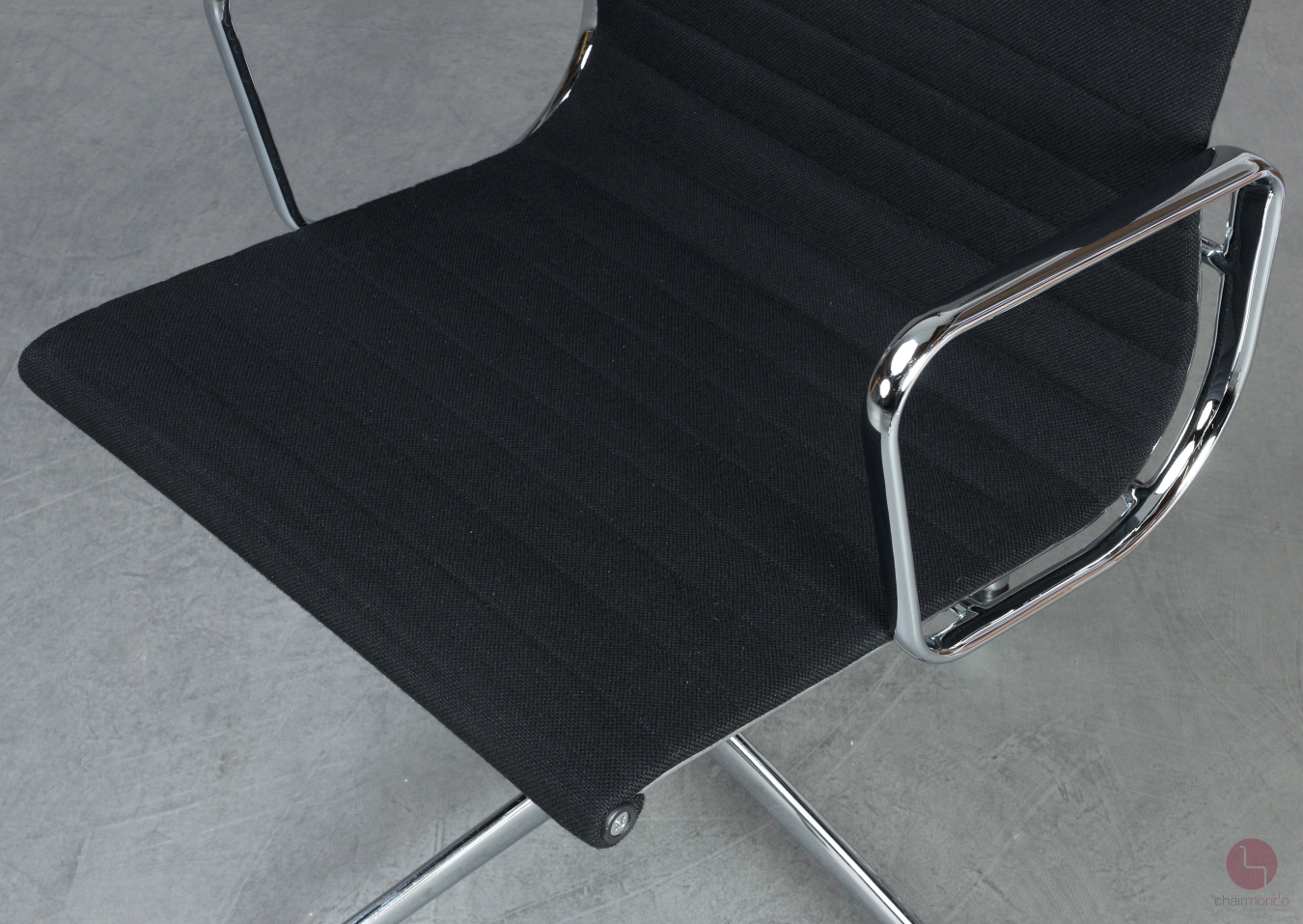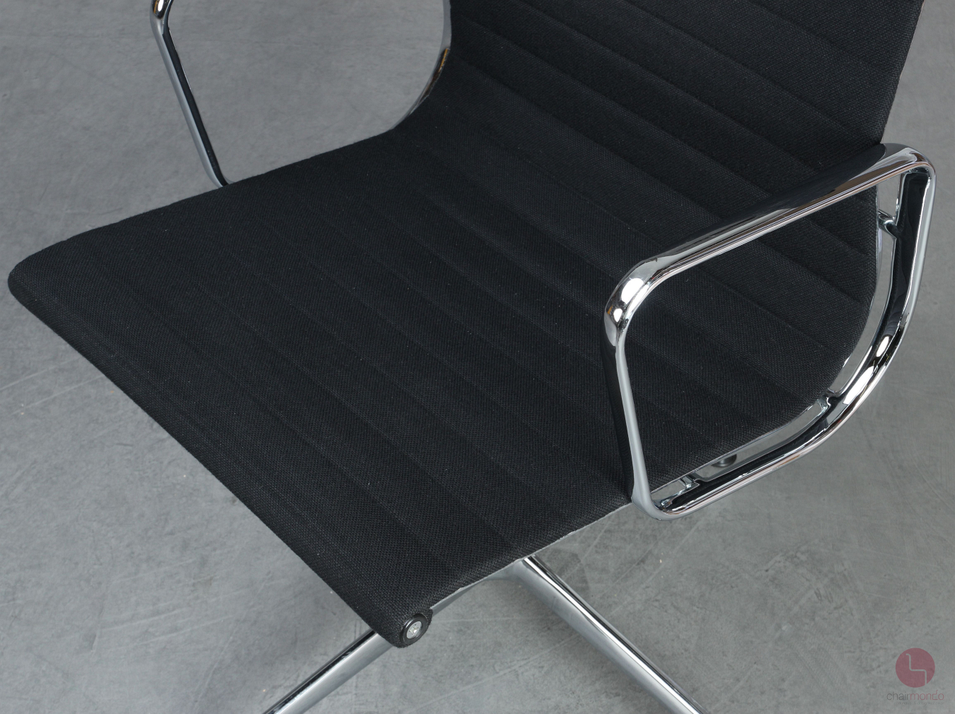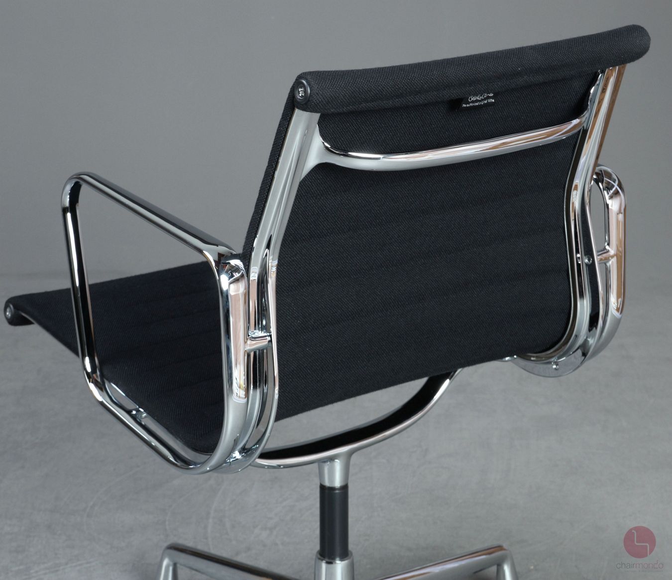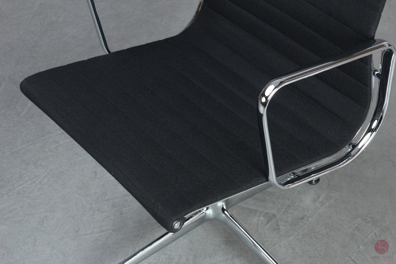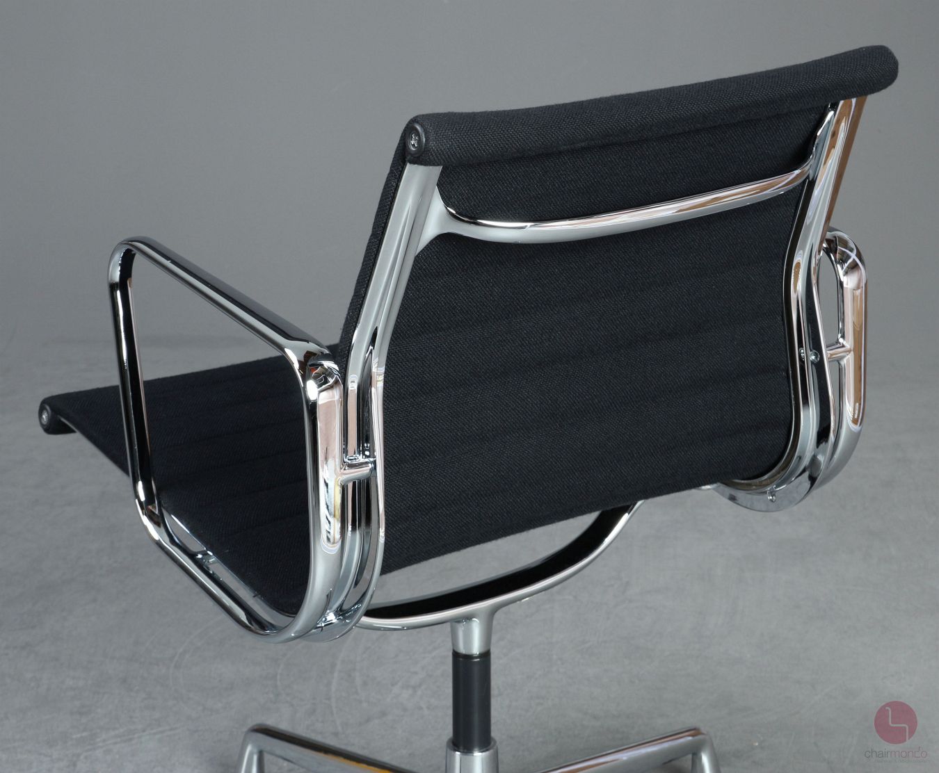 Bei uns erhalten Sie den Designklassiker in der Ausfühurng mit schwarzem Hopsak Bezug, Gestell und Armlehnen sind aus verchromtem Aluminium.