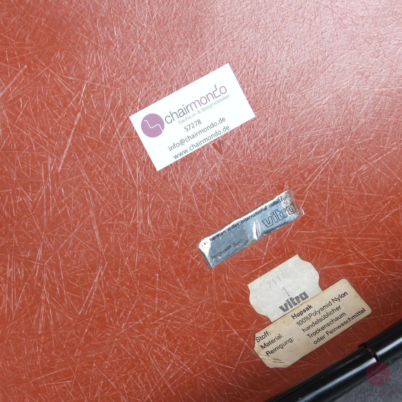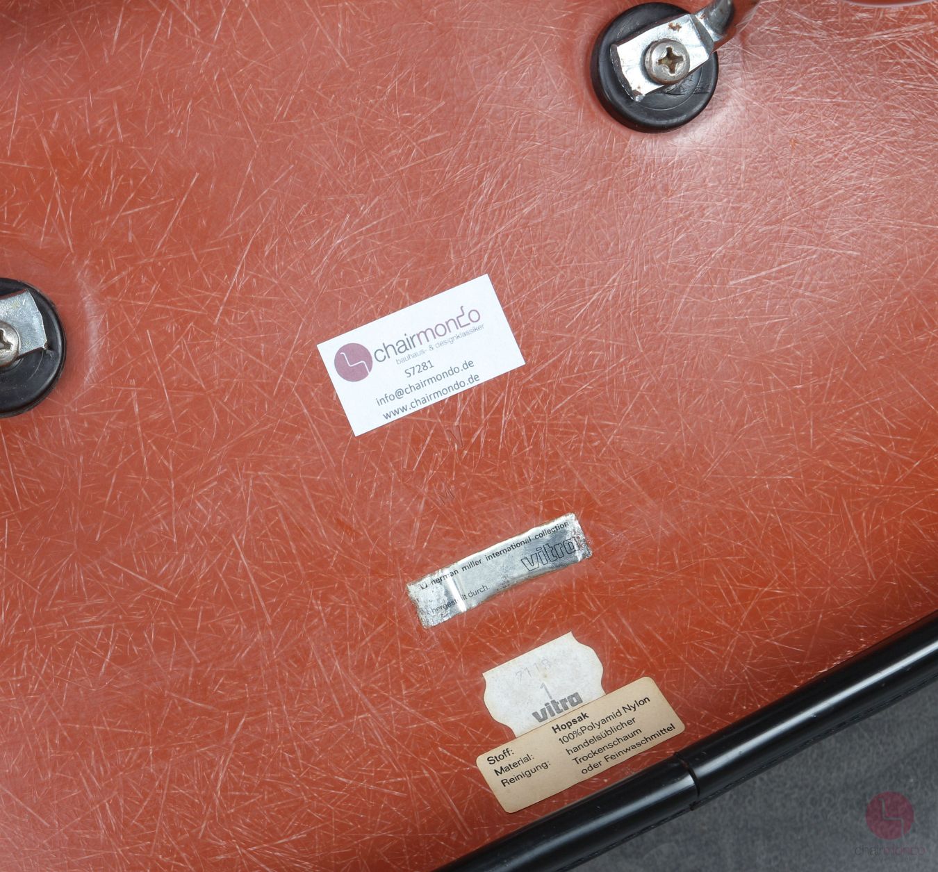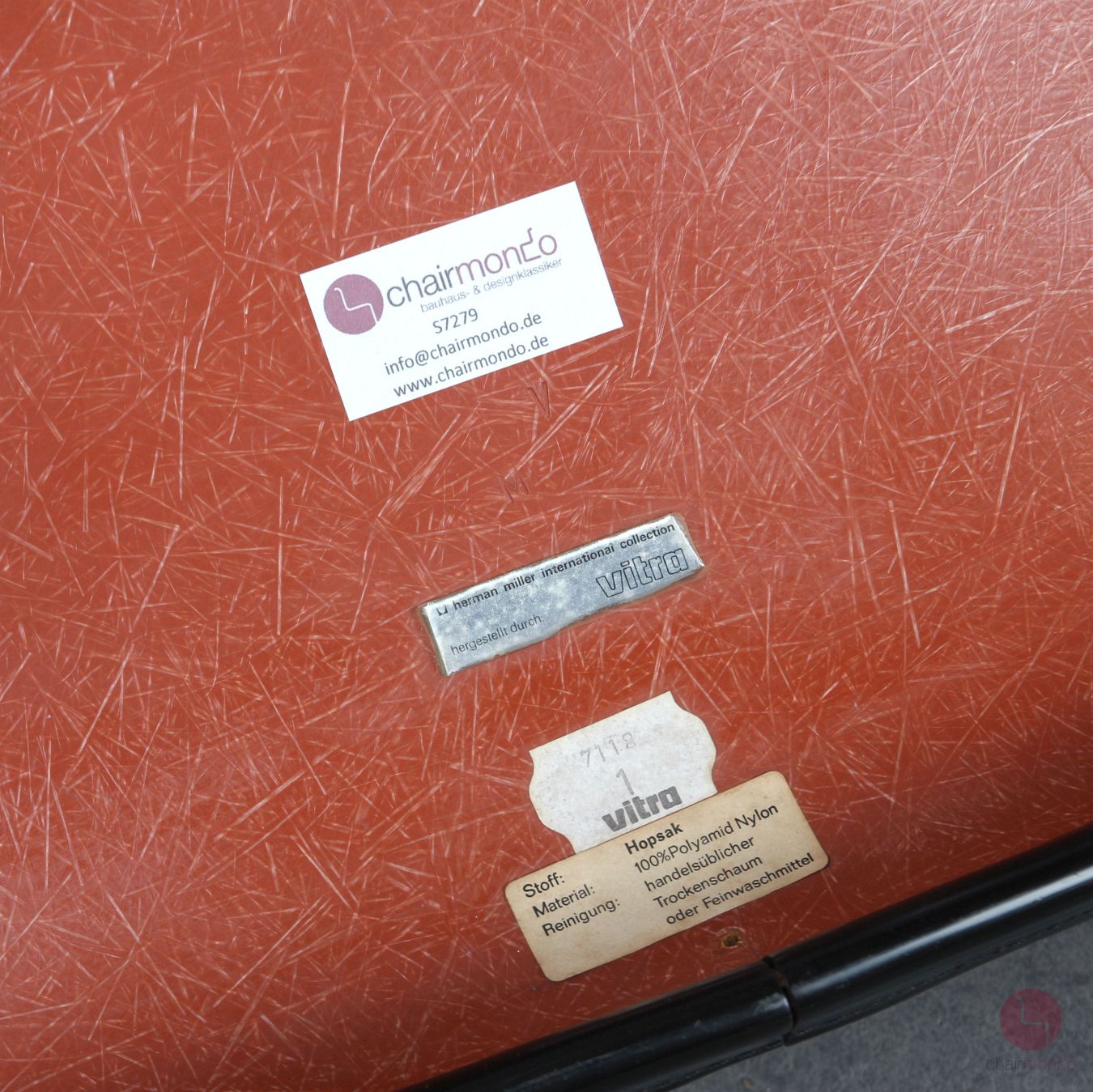 Die Stühle befinden sich in einem sehr guten gebrauchten Zustand! Es bestehen trotz des Alters so gut wie keine Gebrauchsspuren, da sie sehr wenig in Benutzung waren. Dies wird auch daran deutlich, dass jeder einzelne Stuhl noch den originalen silbernen Vitra Aufkleber und einen weißen Aufkleber mit dem Produktionsdatum 1971 hat. Des weiteren befindet sich ein Aufkleber mit Pflegehinweisen für den orangenen Hopsak Stoff. Dieser befindet sich, wie auf den Fotos zu sehen ist, in sauberem und voll intaktem Zustand.