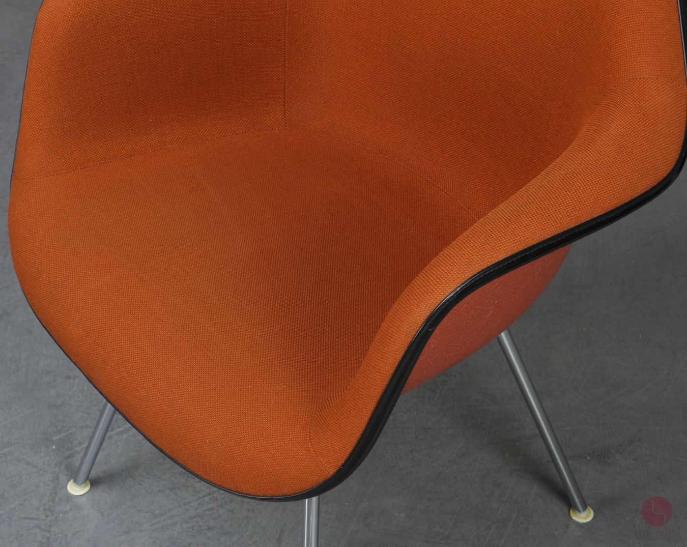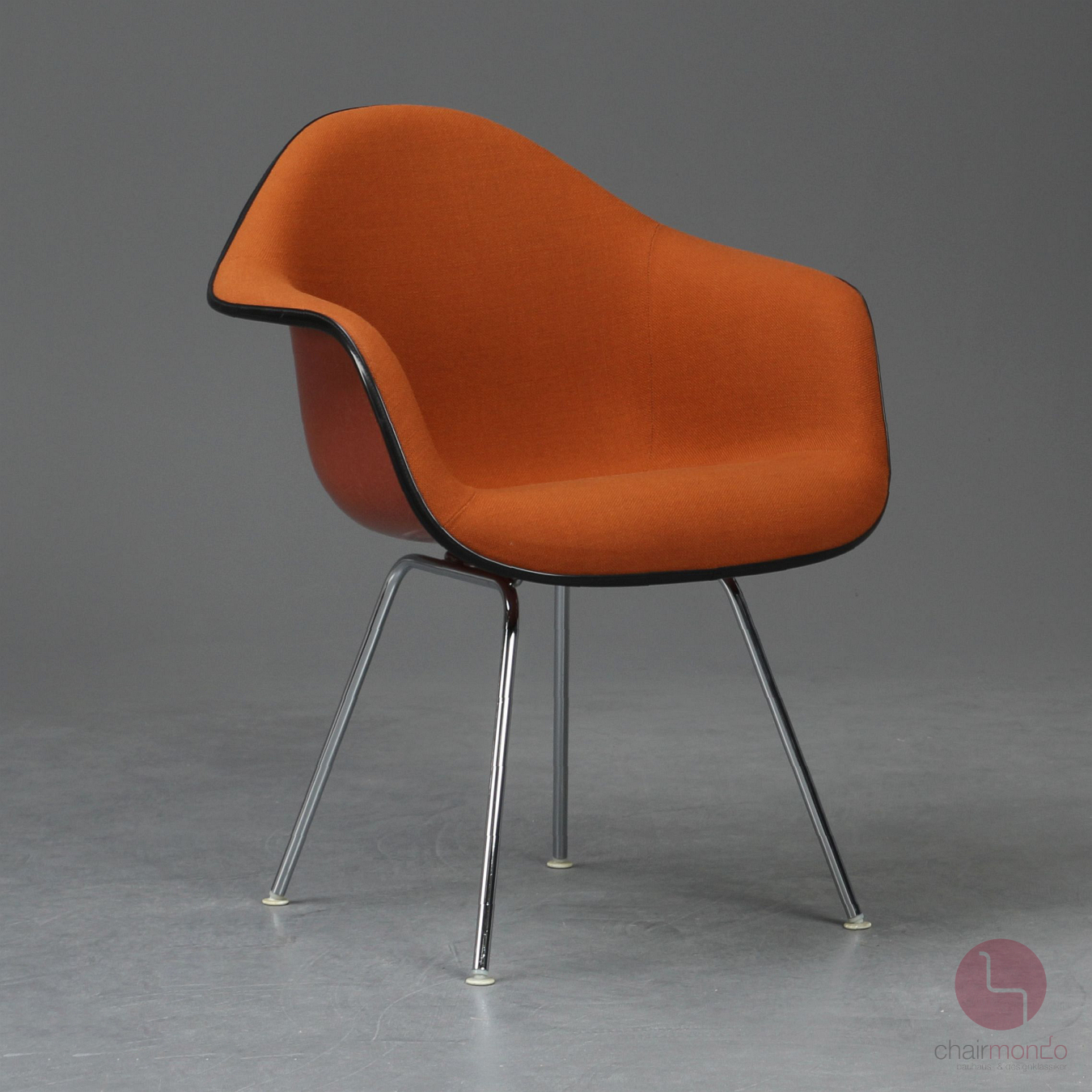 Das Stahldrahtgestell des Armchairs (DAX) sorgt mit der Fiberglas Schale für ein kontrastreiches Zusammenspiel der Materialien. In diesem Angebot erhalten Sie den Stuhl in einer sehr schönen Ausführung mit Fiberglas Schale in Orange und Hopsak Vollpolsterung in Orange - in TOP Zustand!